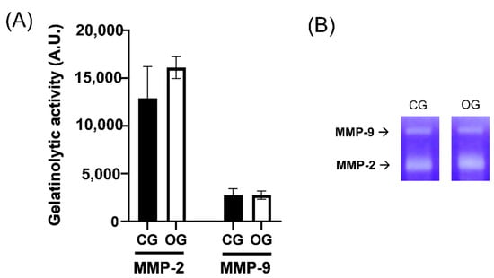 Gelatinolytic activity of MMPs from salivary samples. (A) Bar plots of the densitometric analysis of gelatinolytic bands from MMP9 and MMP2 activity. (B) A representative zymogram: of the gelatinolytic activity of MMP2, and MMP9 pro-forms of MMP gelatinases of salivary samples from control and OSA group (CG and OG, respectively). The intensities of the gelatinolytic activity areas were measured through IMAGE J free scientific image processing software and quantified using a scale of arbitrary units (AU). Statistical analysis was performed by GraphPad MMP-9 (p = 0.97) and MMP-2 activity (p = 0.19).