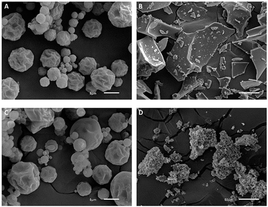 Micrographs of encapsulated green coffee extracts. (A) spray dryer with polydextrose; (B) spray dryer with inulin; (C) freeze-drying with polydextrose; (D) freeze-drying with inulin. (A,B) 3000× magnification; (C,D) 400× magnification.
