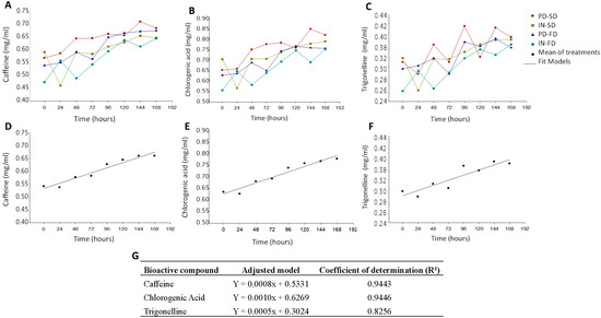 Content of caffeine, chlorogenic acid, and trigonelline during storage in dairy beverages incorporated with encapsulated extracts of green coffee. (A) Dispersion of the caffeine content in each beverage incorporated; (B) dispersion of the chlorogenic acid content in each beverage incorporated; (C) dispersion of trigonelline content in each beverage incorporated; (D) general behavior of caffeine for all beverages; (E) general behavior of chlorogenic acid for all beverages; (F) general behavior of trigonelline for all beverages; (G) models fitted for caffeine, chlorogenic acid, and trigonelline. PD-SD: beverage added from the extract encapsulated with polydextrose by spray-dryer; IN-SD: beverage added from the extract encapsulated with inulin by spray-dryer; PD-FD: beverage added from the extract encapsulated with polydextrose by freeze-drying; IN-FD: beverage added from the extract encapsulated with inulin by freeze-drying.