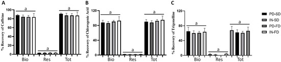 Percentage recovery of main phenolic compounds presents in beverages incorporated with encapsulated extracts of green coffee after in vitro digestion. (A) Caffeine; (B) chlorogenic acid; (C) trigonelline. Bio: bioaccessible fraction; Res: residual fraction; Tot: % Total Recovery. Data presented as mean ± standard deviation of three replicates. Different lower-case letters in each sample represent statistical difference according to the Tukey test (p ≤ 0.05). PD-SD: beverage added from the extract encapsulated with polydextrose by spray-dryer; IN-SD: beverage added from the extract encapsulated with inulin by spray-dryer; PD-FD: beverage added from the extract encapsulated with polydextrose by freeze-drying; IN-FD: beverage added from the extract encapsulated with inulin by freeze-drying.