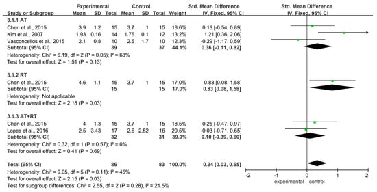 | Vasconcellos et al., [22] | 2015 | AT: 14.1 ± 1.3 | 10 (8/2) | AT | 3 | 12 | CRP, TNF-α, IL-6 |