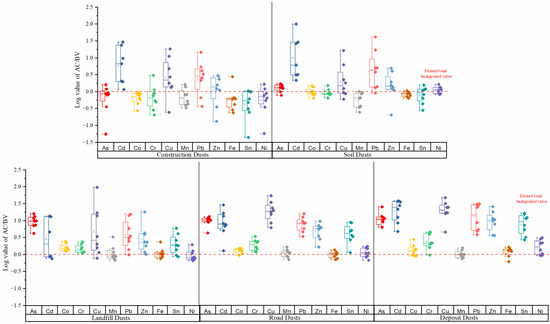 Log values for average accumulation concentration (AC) versus the local background value (BV) of HMs in five different kinds of fugitive dust.