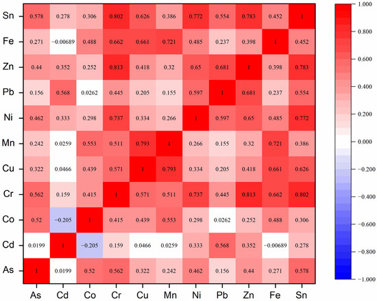 The previous studies have already revealed that Pearson correlation analysis can be used to preliminarily determine the relation between HM concentrations and efficiently determine different sources by analyzing the linear relationship between two different HMs [55,56]. Significant positive correlations between two different HMs generally suggest a closely related source, while weak positive correlations indicate a different origin [20]. Moreover, the results of Pearson correlation analysis can also be used to indicate that the factor analyses from PCA and PMF are reliable [25]. The correlation coefficient value (r) describes the degrees of linear correlation. When |r| > 0.3, it indicates that a correlation exists between the two HMs, while when |r| > 0.7, a relatively high correlation exists [56]. Figure 3 shows the significant positive correlations between Cr and Ni (r = 0.737), Cr and Zn (r = 0.813), Cr and Sn (r = 0.802), Cu and Mn (r = 0.793), Mn and Fe (r = 0.721), Ni and Sn (r = 0.772), and Zn and Sn (r = 0.783), implying that these HMs may be homologous [57]. Week correlations between As and Cd (r = 0.0199), As and Mn (r = 0.242), As and Pb (r = 0.156), As and Fe (r = 0.271), Cd and Cr (r = 0.159), Cd and Mn (r = 0.0259), Cd and Sn (r = 0.278), Co and Pb (r = 0.0262), Co and Zn (r = 0.252), Cu and Pb (r = 0.205), Mn and Ni (r = 0.266), Mn and Pb (r = 0.155), and Pb and Fe (r = 0.237) imply that these HMs may not be homologous [57]. Moreover, other HMs showed moderate correlations, implying that they may come from multiple sources [55].