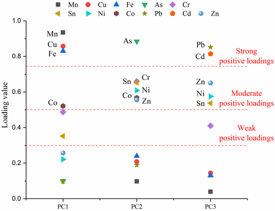 Researchers generally use PCA to determine the most essential factors and minimize data with minimal data loss [59]. Before the source identification, the Kaiser–Meyer–Olkin index was 0.759 and the Bartlett sphericity test result was below 0.001, indicating that the PCA model would be a suitable method for determining the principal components (PCs) of the sources of HM in fugitive dust in the study area [6]. Moreover, Liu et al. classified the degrees of positive loading with loading values as strong positive loading (0.75–1.0), moderate positive loading (0.5–0.75), and weak positive loading (0.3–0.5) [6]. A high loading value indicates that the HMs may be influenced by a similar source [20]. Figure S1 shows three PCs extracted from HMs in fugitive dust based on varimax rotation. The cumulative contributions of these PCs could explain 78.11% of their variance in fugitive dust.