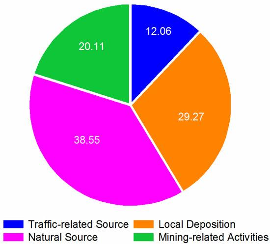 According to the results of the correlation analysis and the PCA, there is no doubt that the HMs in fugitive dust in the mining and metallurgy area originate from nature and mining-related activities. To reveal quantitative information about the contributions from different sources, the PMF model was used to identify the major sources of HMs. Different factor numbers, such as 3, 4, and 5, were set for 20 runs in the PMF model to find high R2 and minimum Q values [61,62]. The Q value was the lowest and the residual value was in the range of −3 to 3 when the factor number was 4. The results indicate that this solution could explain the original data well [63]. Consequently, in Figure 5, four main factors, natural source (38.55%), local deposition (29.27%), mining-related activities (20.11%), and traffic-related source (12.06%), could fully explain the source information for the fugitive dust.