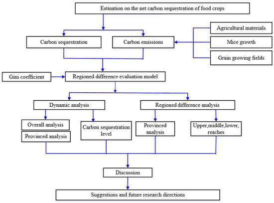 In this paper, the net carbon sequestration of food crops is estimated in the following steps (as shown in Figure 2). First, it is clarified that the net carbon sequestration is influenced by both carbon sequestration and carbon emission (consisting of three components: agricultural materials, rice growth, and grain growing fields), and on this basis, a regional difference evaluation model is constructed using the Gini coefficient. Then, this paper analyzes the dynamic change and regional differences of net carbon sequestration of food crops for the case study area of the YREB in China. In terms of time, this paper separately analyzes the dynamic change trend of net carbon sequestration in the whole study area, and based on this, the net carbon sequestration and the level of carbon sequestration of food crops in 11 provinces (cities) were analyzed dynamically. In terms of space, through the Gini coefficient, this paper analyzes provincial differences of the net carbon sequestration level in the whole study area and the regional differences of the net carbon sequestration level in in the upper, middle, and lower reaches of the YREB. Finally, the results of this paper are discussed, and feasible suggestions and future research directions are given.