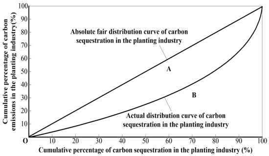 Otherwise, we consider there are regional differences. From Figure 3, A represents the area between the absolute average distribution curve of carbon sequestration and the actual distribution curve of carbon sequestration. B is the area between the actual distribution curve of carbon sequestration and horizontal axis. The Gini coefficient of net carbon sequestration from food crops is A/(A + B).
