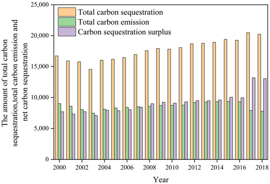 The total amount of the carbon sequestration, carbon emission, and net carbon sequestration from food crops in the YREB from 2000–2018 is shown in Figure 4. The net carbon sequestration of food crops maintains an upward trend, while the carbon emission shows a fluctuating downward trend. From 2000–2018, the net carbon sequestration of the region increases from 7.70669 × 107 t to 1.306066 × 108 t, which increases by 69.47%. The carbon emission decreases from 9.02022 × 107 t to 7.78215 × 107 t, which decreases by 15.09%. The total carbon sequestration increases from 1.672690 × 108 t to 2.024332 × 108 t, which increases by 21.02%. On the whole, the carbon sequestration from food crops in the YREB is gradually increasing. The carbon emission shows a “decline-rise-decline” trend, which indicates that the ecological environment of the food production in the YREB is gradually improving.