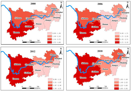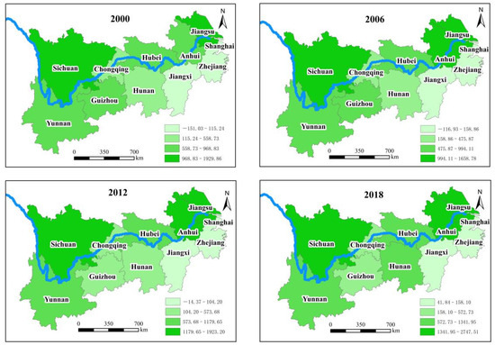 The levels of net carbon sequestration of food crops in various provinces (cities) in the YREB are shown in Figure 5. Here, we only show the results of 2000, 2006, 2012, and 2018 in Figure 5. The detailed results are presented in the Supplementary File (Table S1). Compared with 2000, the net carbon sequestration of food crops in various provinces (cities) in 2018 shows obvious regional differences. Except for Shanghai and Guizhou, the other nine provinces (cities) show an upward trend. Especially, Guizhou as a grain balance area shows the largest decline rate of 18.88%. In addition, Shanghai as a main grain sales area has a decline rate of 12.19%. The possible reason is that the grain sown area has been greatly reduced with the transformation of industrial structure in Guizhou and Shanghai, which leads to a decrease of carbon sequestration accordingly. According to the China Statistical Yearbook, the grain-sowing area of Guizhou falls from 3153.3 thousand hm2 to 2740.2 thousand hm2 from 2000 to 2018, and the grain-sowing area of Shanghai falls from 258.8 thousand hm2 to 133.1 thousand hm2. In addition, the rising range of the net carbon sequestration in Anhui is the largest, which increases by 183.59%, which is followed by Hunan and Jiangxi, i.e., 171.67% and 137.87%, respectively. Although the ranking of net carbon sequestration in Hubei and Jiangsu province in 2018 is not at the top, with the gradual increase of grain-sowing area, the net carbon sequestration is also increasing gradually.