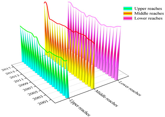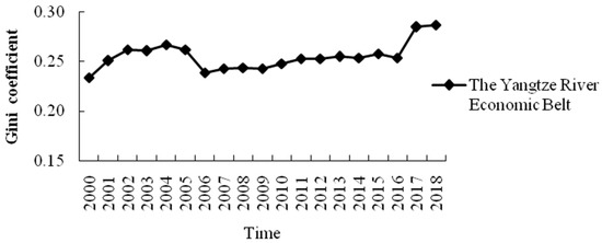 The values of the Gini coefficient indicate that the regional difference in the lower reaches is the largest, followed by the middle reaches and the upper reaches. The main reason for the above differences may lie in the differences of grain-sowing areas in the upper, middle, and lower reaches of the Yangtze River economic belt. Among all regions, the level of economic development in the lower reaches is the highest, and with the increase of the urbanization rate, a large amount of agricultural land has been occupied by industrial land; thus, the area of cultivated land has gradually shrunk in some provinces, such as in Zhejiang and Shanghai. As a result, the difference of grain-sown areas in this region is growing. However, there are many mountains in the downstream area; thus, there is less arable land in some provinces, such as Yunnan and Guizhou, so there is also a certain difference in this region. The provinces in the middle reaches are mainly the main grain-producing provinces, so the difference of grain-sown areas in this region is relatively small.