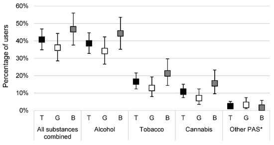 Distribution of use in the last 12 months according to psychoactive substances used and gender among the 277 adolescents. Data are presented as percentages and 95% confidence intervals. B: boys; G: girls; PAS: psychoactive substances; T: total. * At least one use of psychoactive substances among cocaine, glue, lysergic acid diethylamide (LSD), heroin, and/or amphetamines.