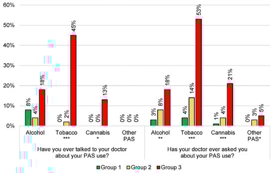 Analysis of the 243 subjects’ discussions with their GPs about their PAS consumption and according to their consumption profile. * p < 0.05; ** p < 0.01; *** p < 0.001. PAS: psychoactive substances. Other PAS: at least one use of psychoactive substances among cocaine, glue, lysergic acid diethylamide (LSD), heroin, and/or amphetamines.