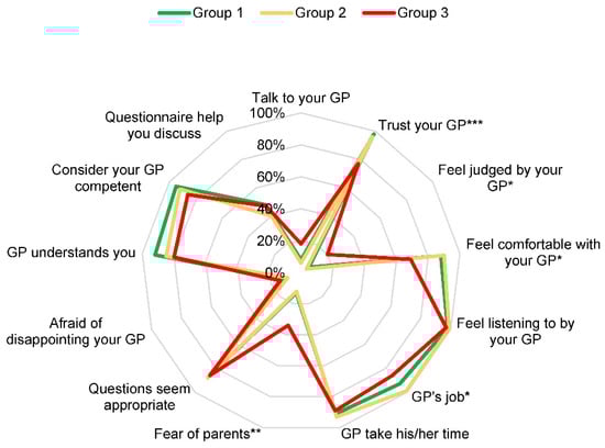 Factor analysis of the 243 subjects according to their relationship with their GP and according to their consumption profile. * p < 0.05; ** p < 0.01; *** p < 0.001. Talk to your GP: “Would you like to talk to your general practitioner about your psychoactive substances use?”; Trust your GP: “Do you trust your general practitioner?”; Feel judged by your GP: “Do you feel judged by your general practitioner?”; Feel comfortable with your GP: “Do you feel comfortable with your general practitioner?”; Feel listening to by your GP: “Do you feel listened to by your general practitioner?”; GP’s job: “Is it your general practitioner’s job to be interested in your psychoactive substances use?”; GP take his or her time: “Does your general practitioner take his or her time when looking into your psychoactive substances use?”; Fear of parents: “Are you afraid your general practitioner will tell your parents about your psychoactive substances use?”; Questions seem appropriate: “Do the questions from your general practitioner seem appropriate?”; Afraid of disappointing your GP: “Are you afraid of disappointing your general practitioner?”; GP understands you: “Do you feel that your general practitioner understands you?”; Consider your GP competent: “Do you consider your general practitioner competent?”; Questionnaire help you discuss: “Would a questionnaire, to be filled out during a consultation, help you discuss these topics with your doctor?”.