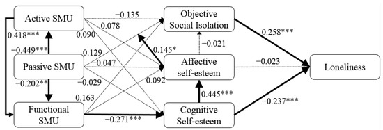 Objective social isolation has a positive relationship with loneliness, which is consistent with the findings of previous studies [41]. Moreover, passive SMU, functional SMU, and cognitive self-esteem have a significant effect on active SMU, cognitive self-esteem, and affective self-esteem, respectively. For older adults, the feeling of connecting with others is more valuable than acquiring specific outcomes.