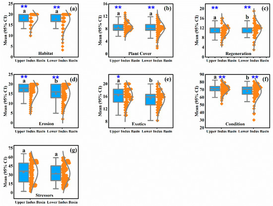 Box and whisker plots for riparian health indicators (a–f) and stressors (g) measured in the upper and lower Indus basin riparian zones of the Indus River in Pakistan. The y-axis denotes the mean scores with 95% confidence interval (CI). The silver horizontal line represents the median, and the silver triangle sign symbolizes the mean. The boxes represent the 25th–75th percentiles, and the whiskers outside the boxes represent the 10th–90th percentiles. The silver curve symbolizes the shape of data distribution, whereas the orange rhombus represents data distribution. Note: significance is at p < 0.01 (**) or p < 0.05 (*) of the Kruskal–Wallis tests. Moreover, pairwise comparisons between the upper and lower Indus basins are marked with non-identical lowercase letters (a,b) using Dunn-Bonferroni post hoc tests.