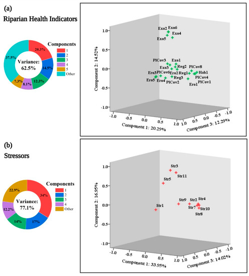Factor analysis (PCA) plots of riparian health indicators (a) and stressors (b) for the upper and lower Indus basin riparian zones of the Indus River in Pakistan. The PCA factor loadings of riparian health (a) and stressor (b) indicator components explain 62.5% and 77.1% of the total variation, respectively. See more details in Figure 2.