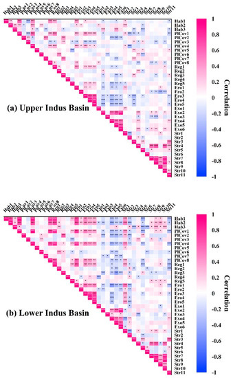 Heat maps of Pearson’s correlation for riparian health indicators with stressors for the upper (a) and lower (b) Indus basin riparian zones of the Indus River in Pakistan. A dark color indicates a strong relationship, whereas a light color represents a weak relationship. *** Correlation is significant at the 0.001 level (two-tailed); ** Correlation is significant at the 0.01 level (two-tailed); * Correlation is significant at the 0.05 level (two-tailed). See more details in Figure 2.