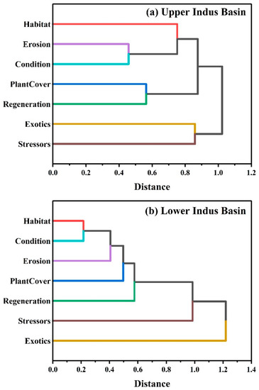 Dendrograms produced by agglomerative hierarchical clustering for riparian health indicators sub-indexes/index with stressors index for the upper (a) and lower (b) Indus basin riparian zones of the Indus River in Pakistan.
