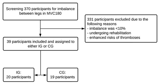 Three hundred and seventy (370) participants were initially recruited from North-West Germany (Oldenburg, Germany) between September 2021 and April 2022 from a sports study program and local sports club. To answer the research question, MSt values of the plantar flexors were screened for imbalances of at least 10% between legs, as Chin et al. [32] refer to enhanced risk of injury due to a 10% bilateral leg strength difference and Lantto et al. [16] and Stevens et al. [12] demonstrated muscular imbalances after finishing rehabilitation. Participants that demonstrated an MSt difference of at least 10% between their right and left plantar flexors in the extended knee MVC testing in the pre-test were included for further evaluation. A total of 331 subjects were excluded because of a strength imbalance of less than 10%, undergoing rehabilitation programs or exhibiting enhanced risks of thromboses at the time of the study. Consequently, 39 male, athletically active participants (age: 28.7 ± 3.2 years, height: 179.9 ± 5.2 cm, weight: 83.6 ± 6.3 kg) were included for further calculation (see Figure 1). Participants were allocated to IG and CG based on their willingness to perform a daily one-hour static stretching protocol: IG comprised 20 and CG 19 participants. The origin of the muscular imbalances varied between participants and was not exclusively attributed to previous injuries. All participants performed the required stretching frequency and duration, and thus, effects were calculated considering all values without any dropout.