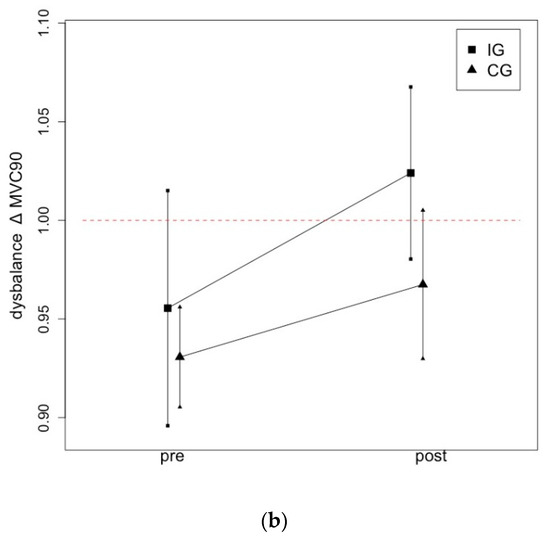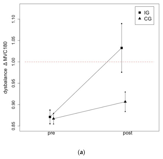 Table 3 provides information for group effects between the strong and the weak leg in IG and CG and the ratio of imbalance (∆) as well as the level of significance. The p-values in the table provide information on whether there was a significant difference between the legs in the pairwise comparison between the legs within one group.