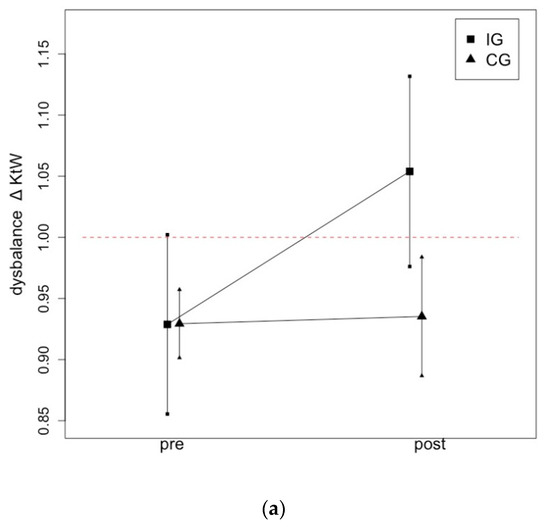 The data analysis was performed with SPSS 28. Data are provided using Mean (M) ± Standard Deviation (SD). The normal distribution was checked via the Shapiro–Wilk test. The best performances in each test were used for the statistical analysis. Reliability was determined and is provided as intraclass correlation coefficient (ICC), 95% confidence interval (95% CI) and coefficient of variability (CV) for listed monitoring assessments, which are listed in Table 1. Moreover, the Levene test for homogeneity in variance was performed. One-way ANOVA was used to rule out significant differences between groups (and legs) in pre-test values. Two-way ANOVA (two groups × two times) with repeated measures was performed for the collected parameters. The Scheffé test was used as a post-hoc test for mean differences. Effect sizes are presented as Eta squares (η²) and categorized as: small effect η² < 0.06, medium effect η² = 0.06–0.14, large effect η² > 0.14 [33]. Additionally, Cohen’s d [33] effect sizes are reported and categorized as: trivial d < 0.2, small d < 0.5, medium d = 0.5–0.8, and large effects d > 0.8. Furthermore, differences in pre-test values within IG and CG between the legs of the participants were evaluated using a paired t-test, assuming that the legs of a person cannot be viewed to be independent of each other. To investigate the influence of the intervention on muscular imbalances, a ratio between the weak leg and the strong leg was calculated compared to the known hamstrings-to-quadriceps ratio from the literature [34,35]. T Post-hoc power (1-β) was calculated via G-Power (Version 3.1, Düsseldorf, Germany). The level of significance was p < 0.05. Pearson correlations were calculated for pre- and post-comparisons in MSt.