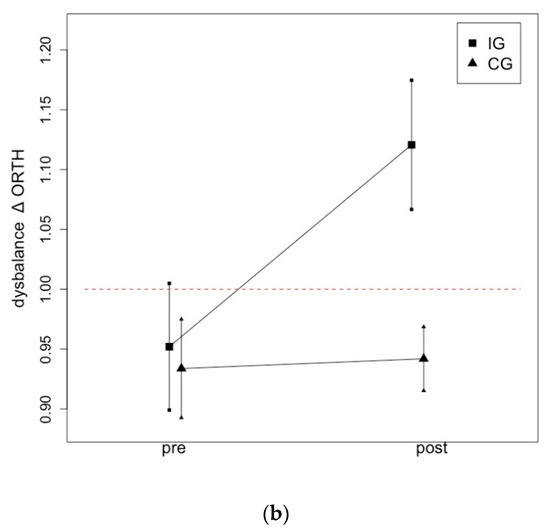 For ORTH, the two-way ANOVA revealed high effects for the time-dependent effect (η² = 0.11, p = 0.003) and time * group interactions (η² = 0.92, p < 0.001). The Scheffé test determined significant, large magnitude effect size increases from pre- to post-test for IL and CL (p < 0.001, d = 1.21), IL and CGw (p < 0.001, d = 1.46) and IL and CGs (p < 0.001, d = 1.49). However, no significant differences could be determined in the other groups with p = 0.66–0.99.