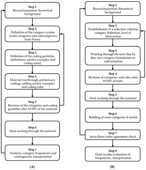 Theme analysis procedure. (A) deductive category assignment; (B) inductive category formation.