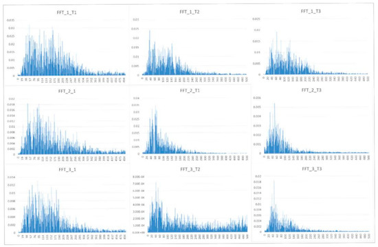 Examples of fast Fourier transformation (FFT) analysis of three participants in different time frames (in the beginning, T1, in the middle, T2, and in the end of the trial, T3), displayed as a plot of frequency in Hz (x-axis) against signal energy (y-axis).