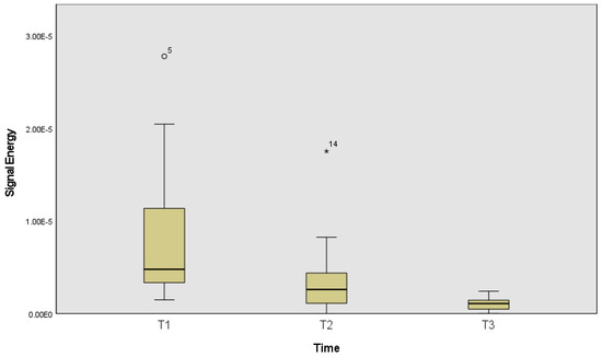 Signal energy was statistically significantly different across the different time points (T1, T2 and T3) χ2(2) = 9.56, p = 0.008, effect size of 0.53. Pairwise comparisons were performed, with a Bonferroni correction for multiple comparisons. Pairwise comparison only identified differences between the first and the last (p = 0.007) time frame (beginning and ending of the fatigue protocol).