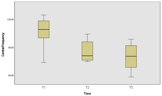 The computed central frequency is also statistically significantly different between time frames χ2(2) = 10.75, p = 0.005, effect size of 0.67; thus, differences in the pairwise comparison only identified differences between the first and the last time frame (p = 0.003).