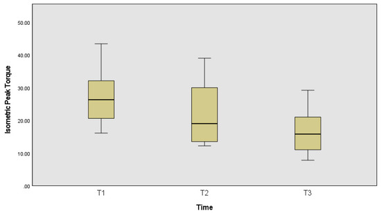 The isometric peak torque (Figure 4) was also statistically significantly different between time frames χ2(2) = 16.22, p < 0.001, effect size of 0.90, with significant statistical differences between the first and the last time frame (p < 0.001).