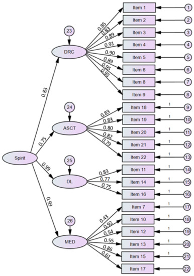 Structure of the Polish version of the Interfaith Spirituality Scale (DRC = direct connection with the creator, ASCT = asceticism, DL = divine love, and MED = meditation).