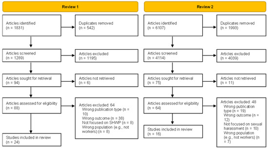 A minimum of two reviewers screened each article using the Rayyan software [11]. We identified 1831 and 6107 articles for the first and second review. Duplicates were identified automatically using Rayyan, then screened by the reviewers to ensure only identical papers were removed. After removing duplicates, 1289 and 4114 articles were screened by titles and abstracts to include only the papers related to the topic of the reviews. At this stage, the agreement percentage between raters was 95% (k = 0.415) for the first review and 98% (k = 0.403) for the second. Next, the reviewers read each article in full, leading to 24 articles were included for the first review and 16 articles for the second review. The agreement percentage for reviews 1 and 2 were 76% (k = 0.415) and 87% (k = 0.681) for the second. The reviewers were instructed to opt for including an article rather than excluding it when in doubt about their decision. Disagreements between the reviewers were settled by a third reviewer in virtual meetings, where each of the first two reviewers stated their reasoning to either including or excluding an article and then, with the input of the third reviewer, they reached consensus to make a final decision. The inclusion process is detailed in the Preferred Reporting Items for Systematic Reviews and Meta-Analyses (PRISMA) consort diagram (see Figure 1).