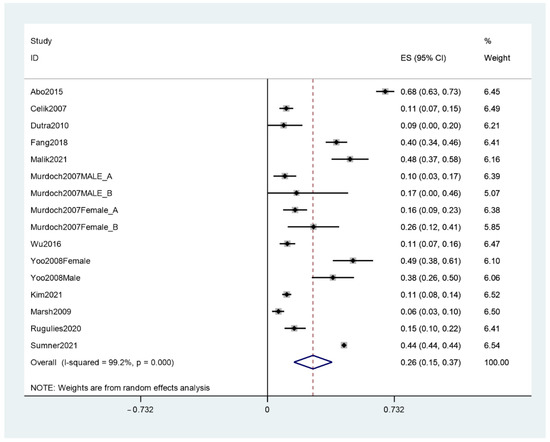 Among the included articles, 12 reported the prevalence rates of depression among workers who experienced SHWP [14,20,25,26,27,28,29,30,32,33,35,36]. Meta-analysis results show a combined prevalence of depression of 26% (95% CI, 0.15–0.37). However, the heterogeneity of studies is 99.2% (see Figure 2).