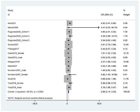 Figure 3. Meta-analysis of odd ratios of depression among workers who experienced SHWP.