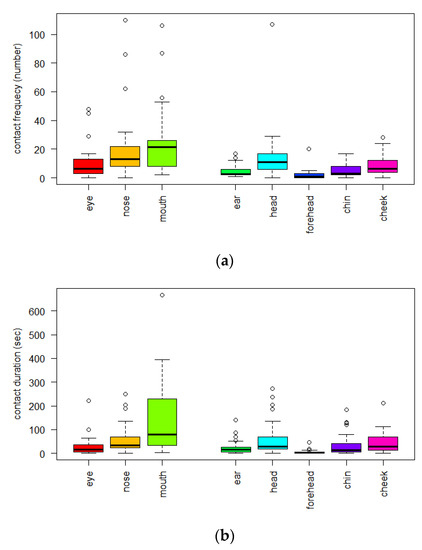 (a) Hand-to-face contact frequency (n = 30, 2 h observation time, frequency/person/2 h); (b) Hand-to-face contact duration (n = 30, 2 h observation time, sec/person/2 h).
