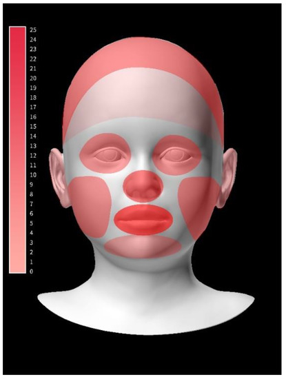 Visualizing frequency of hand-to-face contact (number/person/2 h). The color bar expresses the contact frequency from 0 to 25. The darker the color, the more frequent the contact.