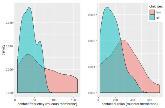 The density distribution of frequency and duration of mucosal contact, including the eyes, nose, and mouth, showed a wider distribution in boys than in girls (Figure 3).