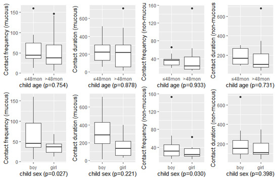 There were no statistically significant differences in the frequency and duration of mucosal contact according to age. The mucosal and non-mucosal contact frequencies were significantly different according to gender (p = 0.027 and p = 0.030, respectively). Boys tended to touch their mouth, eyes, and nose more frequently than girls, and more than other areas of the face, i.e., non-mucous areas. However, there were no differences in contact duration between mucous and non-mucous contacts (Figure 4).