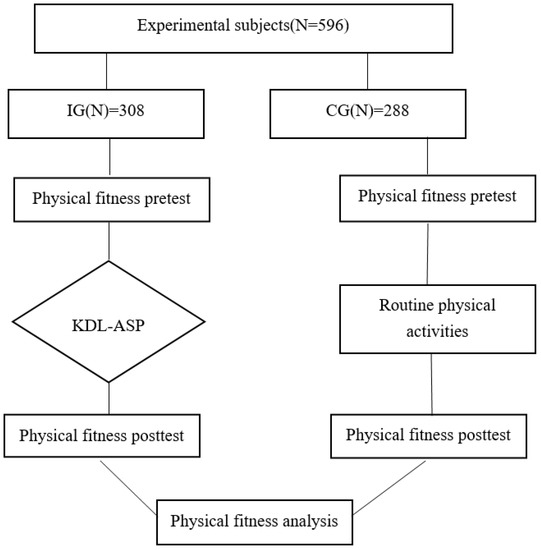 Intervention design. The children and adolescents participating in the study were divided into two groups (IG and CG) according to the requirements of the experiment. The experimental intervention methods were different, but the teaching level of the PE teachers, the physical education learning environment of the students, and the students’ levels and grades were the same. IG students participated in the KDL-ASP, while CG students carried out regular school sports activities, such as regular PE classes, recess, and sunshine sports activities based on athletics and ball games. These regular physical activities lasted the same amount of time in both the IG and CG. In terms of the main factors affecting physical fitness, such as exercise frequency, exercise intensity, duration, and exercise content [21], the IG followed the specific contents of the KDL-ASP (see Table 3). The specific requirements are shown in Table 4. PE teachers monitored the exercise intensity by having some students wear heart-rate bands during the intervention. The specific intervention process is shown in Figure 2.