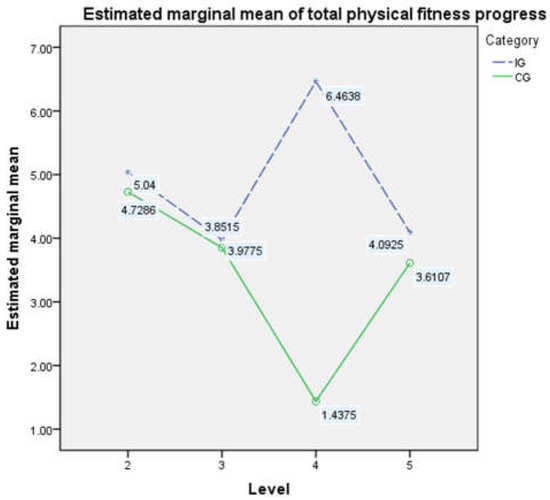 Due to the different levels of the pre-test of physical fitness indexes between the IG and CG, this study focused on the progress. The multi-factor analysis of variance showed that the total score improvement of the physical fitness index showed the effects of intervention and gender and interactions between intervention and level (F intervention = 12.029, p < 0.01; F sex = 4.913, p < 0.05; F level × intervention = 9.629, p < 0.01) (see Table 6). Figure 3 presents the simple effect analysis of the interaction between the intervention and the level, which shows that after the intervention trial, regardless of the level, the average improvement in the total physical fitness scores of children and adolescents participating in the intervention was higher than that of the students who did not. Therefore, the difference of the intervention will be analyzed separately from the aspects of gender and level. Due to the excessive number of results, each section only presents and analyzes the results with significant differences.