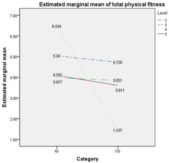 The interaction effect between the intervention and the level of progress of physical fitness scores after the experiment.