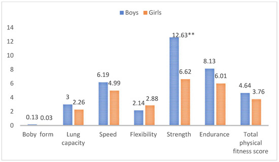 Since gender consisted of two variables, an independent sample t-test was used. Figure 4 presents the significant differences in the improvement of strength between boys and girls (p strength < 0.01) in the IG. Judging from the mean, the improvement in the strength of boys was significantly higher than that of girls. With the exception of flexibility, the improvement in all physical fitness index scores and total scores of boys was significantly better than that of girls.