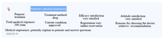 Data collected from a leading OHC in China, www.haodf.com, was used to verify the hypothesis. This platform has gathered about 240,000 real-name registration of doctors from different hospitals and served more than 74 million patients by the end of 2021. We chose this platform as the research sample for the following reasons: (1) The platform is a popular OHC in China, and widely used in relevant research [8,9,11,17,18,60,61,62]; (2) The platform provides reasons why some health consumers choose a doctor in the patient review section; and (3) There are enough patients on the platform to vote for doctors. Figure 2 presents an example of one physician’s patient review section; this section includes the purpose of patients, treatment, efficacy satisfaction, attitude satisfaction, costs, state of illness, way of registration, and reasons for patient choice.