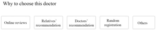 Figure 3 gives the selection of reasons of health consumers in the platform. According to Figure 3, there are five reasons for consumers to choose a doctor: online reviews, relatives’ recommendations, doctors’ recommendations, random registration, and others. Patients can choose at least one option as their reason after online medical consultation.