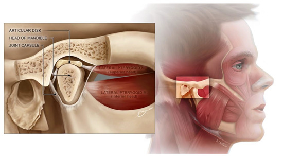 Mandibular movement is a natural, continuously, and often unconsciously performed activity. Cutting, tearing, and grinding the food with ones’ teeth is almost automatic during meal consumption. For the rest of the day, the mandible movements are involuntary in relation to the maxilla. The intensity of night tightening and grinding is associated not only with occlusive but also with emotional conditions [1]. The arrangement of the bones, tendons, ligaments, and muscles required to move the mandible is a complex and precise mechanism (Figure 1). It can compensate for minor disturbances, which are expressed as a change in muscle tone and bone remodeling [2,3]. More significant deviations overwhelm the adaptation possibilities and often result in symptomatic temporomandibular disorders (TMDs). The causes of such an imbalance include tooth loss, poorly adjusted restorations, improperly selected fixed prosthetic elements, excessive muscle tension, depression, bone fractures, and degenerative diseases [1,4,5,6].
