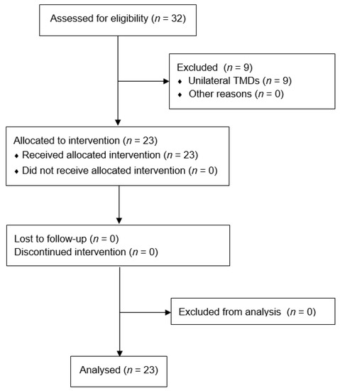 - Schiffman, E.; Ohrbach, R.; Truelove, E.; Look, J.; Anderson, G.; Goulet, J.-P.; List, T.; Svensson, P.; Gonzalez, Y.; Lobbezoo, F.; et al. Diagnostic Criteria for Temporomandibular Disorders (DC/TMD) for Clinical and Research Applications: Recommendations of the International RDC/TMD Consortium Network and Orofacial Pain Special Interest Group. J. Oral Facial Pain Headache 2014, 28, 6–27. [Google Scholar] [CrossRef]