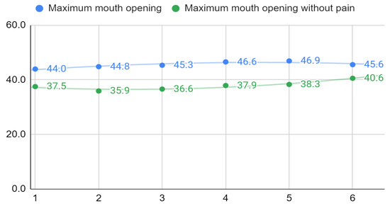 The complete correlation matrix is provided in Supplementary Materials, Table S2 and p-values in Table S3. Values that meet the criterion of statistical significance are shown in bold, and among them, strong correlations are additionally boxed. The total results of the Fonseca questionnaire were statistically significantly correlated with 340 out of 348 (98%) other variables. Almost all of these correlations were weak, and no pattern could be identified among the strong ones. The correlation coefficients between the subjective assessment of acoustic symptoms on VAS and their severity at opening the mouth in the physical examination ranged from 0.45 to 0.63 at different visits and for different parties, and they were all statistically significant. For spontaneous pain and pain provoked by physical examination assessed subjectively on the VAS, no patterns of correlation with other variables were observed. Slightly strong statistically significant negative correlations with the severity of acoustic symptoms in the left joint or with the right-sided movement of the mandible in physical examination appearing at some visits seem to be a coincidence. The maximum mouth opening correlated strongly and statistically significantly with the maximum pain-free mouth opening at each visit (Table 2). The mean values of both variables for the study group are shown in Figure 4. The graph shows the second-degree polynomial trend curves. For MMO and MMOwoP, regression models 42 + 1.9x − 0.2x2 (R2 = 0.85) and 38.5 − 1.6 + 0.3x2 (R2 = 0.92) were fitted, respectively. The values of the mobility of the mandible in the transverse plane and the associated acoustic symptoms assessed in the physical examination showed no correlation pattern with any other variables.