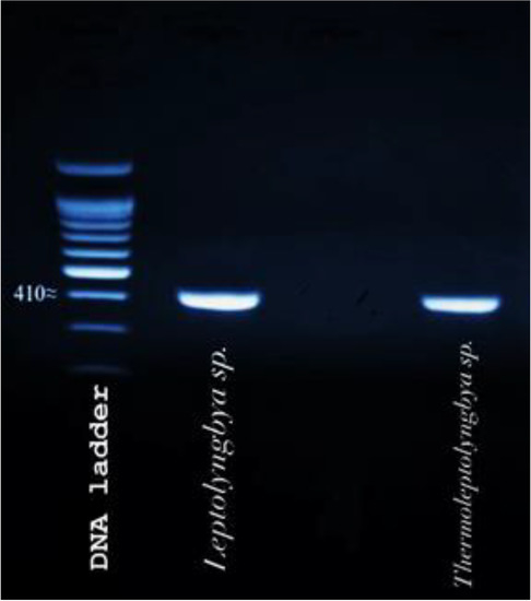 The partial 23S rDNA genetic locus of those cyanobacterial strains whose extracts showed significant antimicrobial activity was amplified using universal algal primers developed by Sherwood and Presting [47]. The size of the PCR product was nearly 410 bp according to the DNA ladder (Figure 1). The identities of the two cyanobacterial isolates and their best matches were retrieved via BLASTn search of species and their molecular characterizations was based on close similarity to sequences deposited in Genbank.