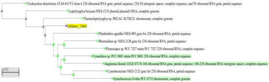 A neighbor-joining phylogenetic tree of Thermoleptolyngbya sp. The sequence of the organism under study is highlighted in yellow. Green highlights reference database sequences.